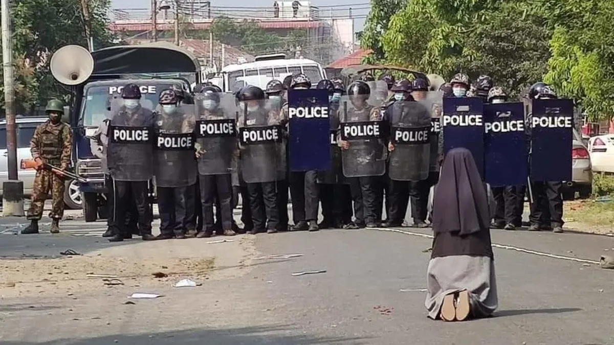 La imagen ha dado la vuelta al mundo. En el día con más violencia en Myanmar, con al menos 18 víctimas mortales y más de 30 heridos por la represión de la Policía contra los jóvenes manifestantes que protestaban de forma pacífica, una religiosa, con lágrimas en los ojos y, de rodillas, logró parar a los uniformados y evitar ejecuciones a sangre fía.