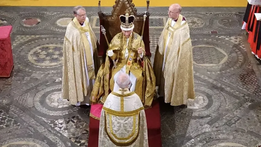 Mientras tanto, entre misteriosos velos de regias unciones “sacramentales”, Carlos III de Inglaterra es coronado “Rey por la gracia de Dios” y “al servicio del pueblo”.