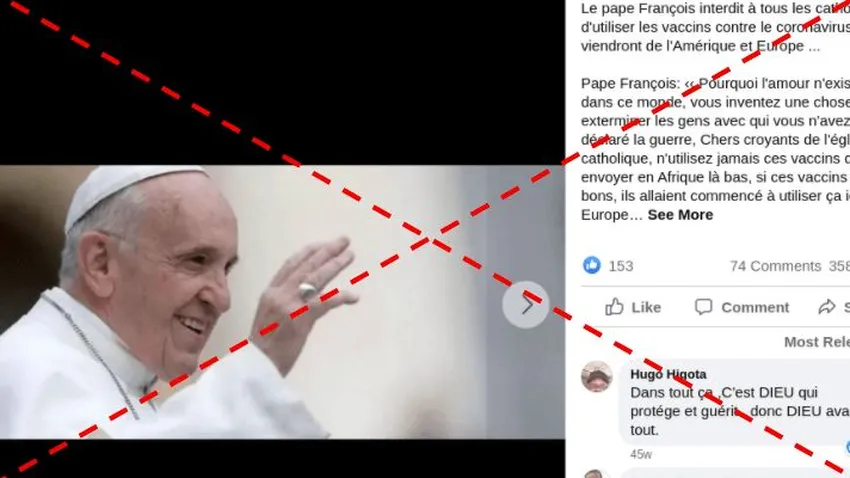Se trata de un mensaje inventado para confundir a los católicos africanos. De hecho, el Papa ha animado a las poblaciones del mundo a vacunarse y él mismo ha sido vacunado (al igual que su predecesor, Benedicto XVI).