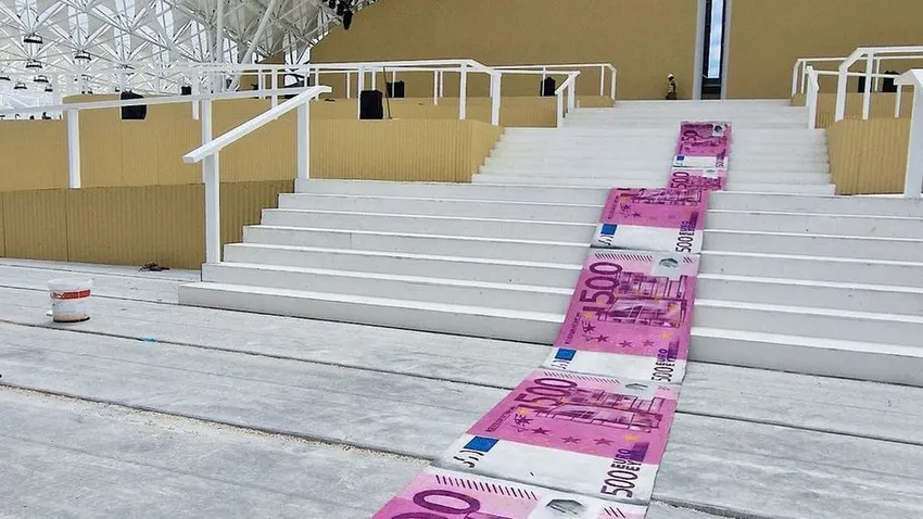 Instala una alfombra de billetes gigantes de 500 euros sobre el escenario central de la JMJ de Lisboa