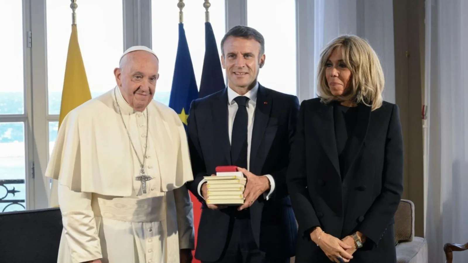 Como obsequio, el mandatario galo le entregó dos libros: "Ex-voto marins de Notre-Dame-de-la-Garde" de Félix Reynaud, una obra de investigación sobre miles de ofrendas realizadas a la considerada guardiana de los marineros, cuya icónica basílica marsellesa visitó este viernes el pontífice; y una edición original de "El verano", del escritor galo nacido en la Argelia francesa Albert Camus.