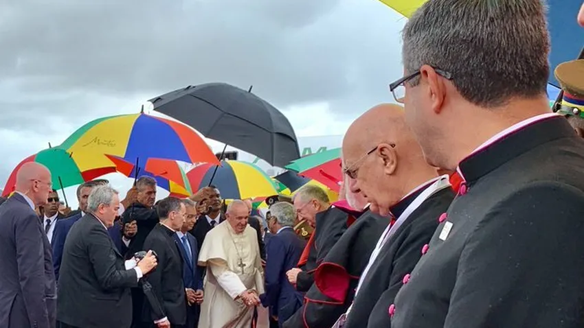 El Papa fue recibido con paraguas multicolores, un símbolo de la convivencia multiétnica e interreligiosa que caracteriza a este rincón del mundo. 1,2 millones de habitantes recibieron al Papa en unas calles engalanadas. Muchos cánticos de júbilo, danzas y rezos cubrieron la llegada papal.