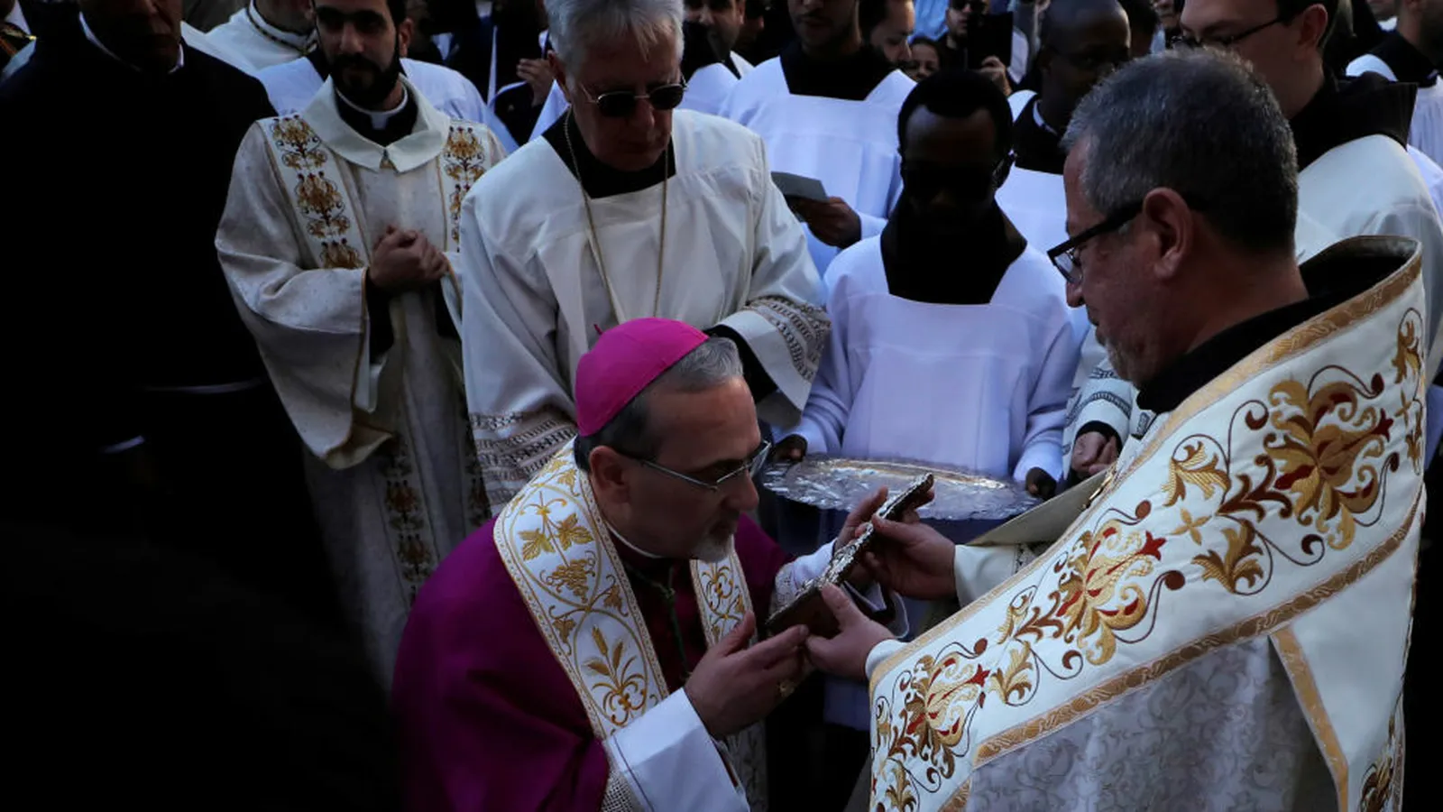 Representantes de las distintas confesiones cristianas y notables de la ciudad recibieron a Pizzaballa, que entró en la Basílica de la Natividad, donde la tradición señala que nació Jesús en la gruta que alberga la iglesia.