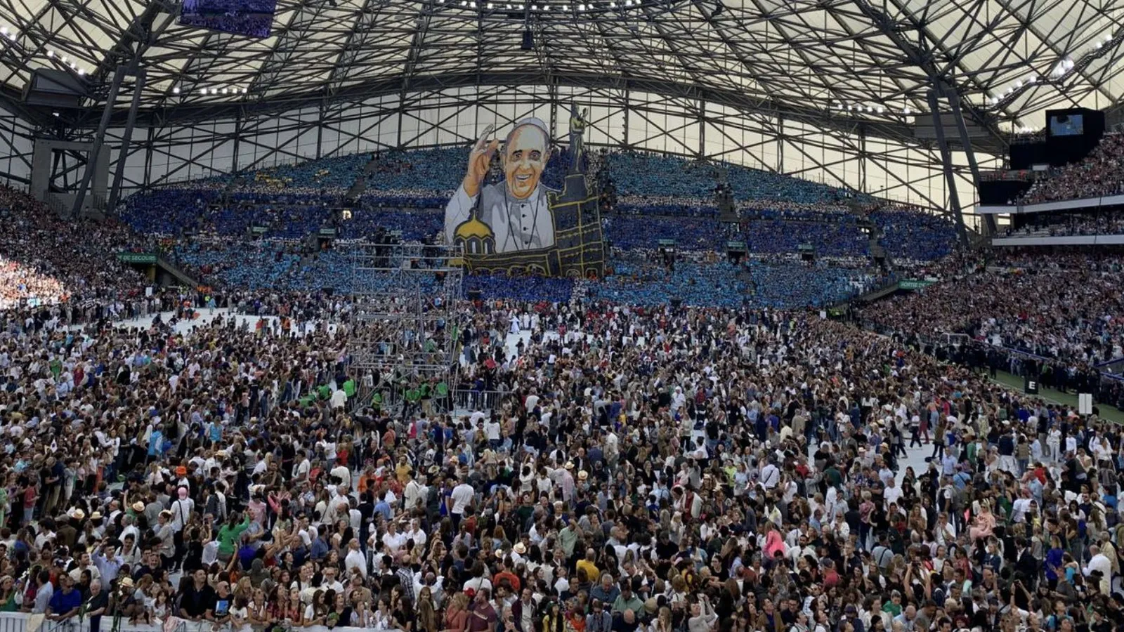Altar sencillo, de color blanco y azul y el velódromo abarrotado de decenas de miles de personas, para celebrar la eucaristía presidida por el Papa Francisco, que cerrará su visita a Marsella. Flanqueado por una imagen de Nuestra Señora de la Guardia. Y presidido por una gran cruz. Entre las autoridades, el presidente Macron y la gobernadora del banco europeo.