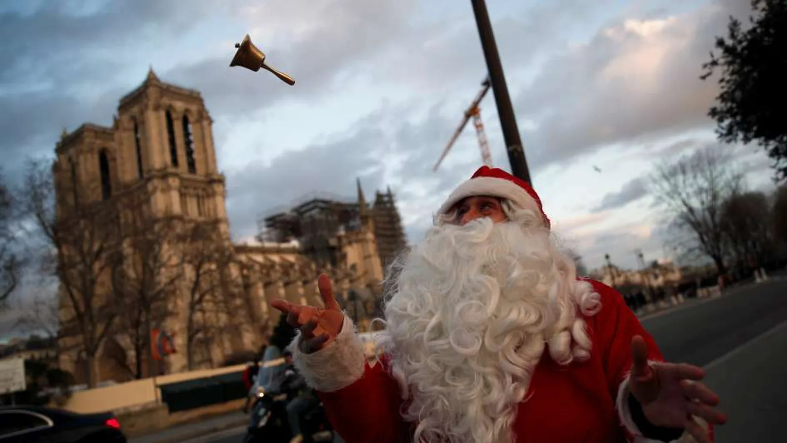 AP | Un Papá Noel posa para los turistas y lanza su campana al aire frente a la Catedral de Notre Dame en París.