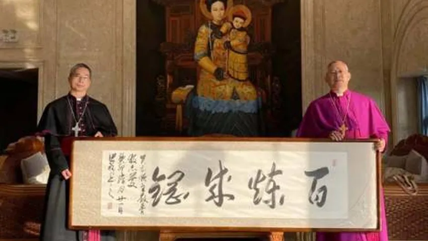 "Monseñor Vincenzo Zhan expresó su felicitación y sus mejores deseos al recién nombrado obispo dedicándole una inscripción con el dicho chino 'Bai Lian Cheng Gang' ('Te has hecho muy fuerte tras un largo periodo de prueba')"
