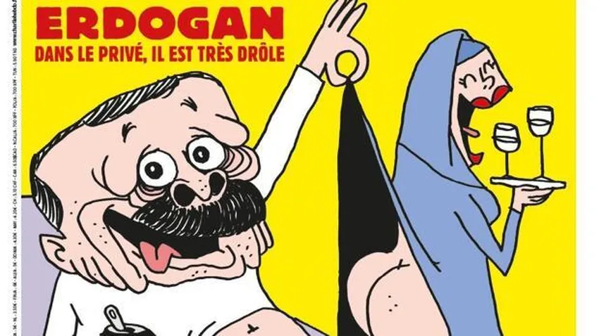 La revista satírica Charlie Hebdo ha entrado de lleno en la polémica que enfrenta a Turquía y Francia a causa de las polémicas viñetas de Mahoma. Y lo ha hecho a su manera. En la portada de su número de esa semana, el semanario abre con una caricatura en calzoncillos del presidente turco, Recep Tayyip Erdogan, en la que levanta la túnica a una mujer musulmana y deja al aire sus nalgas y sus piernas, mientras dice: "¡Ouh, el profeta!".