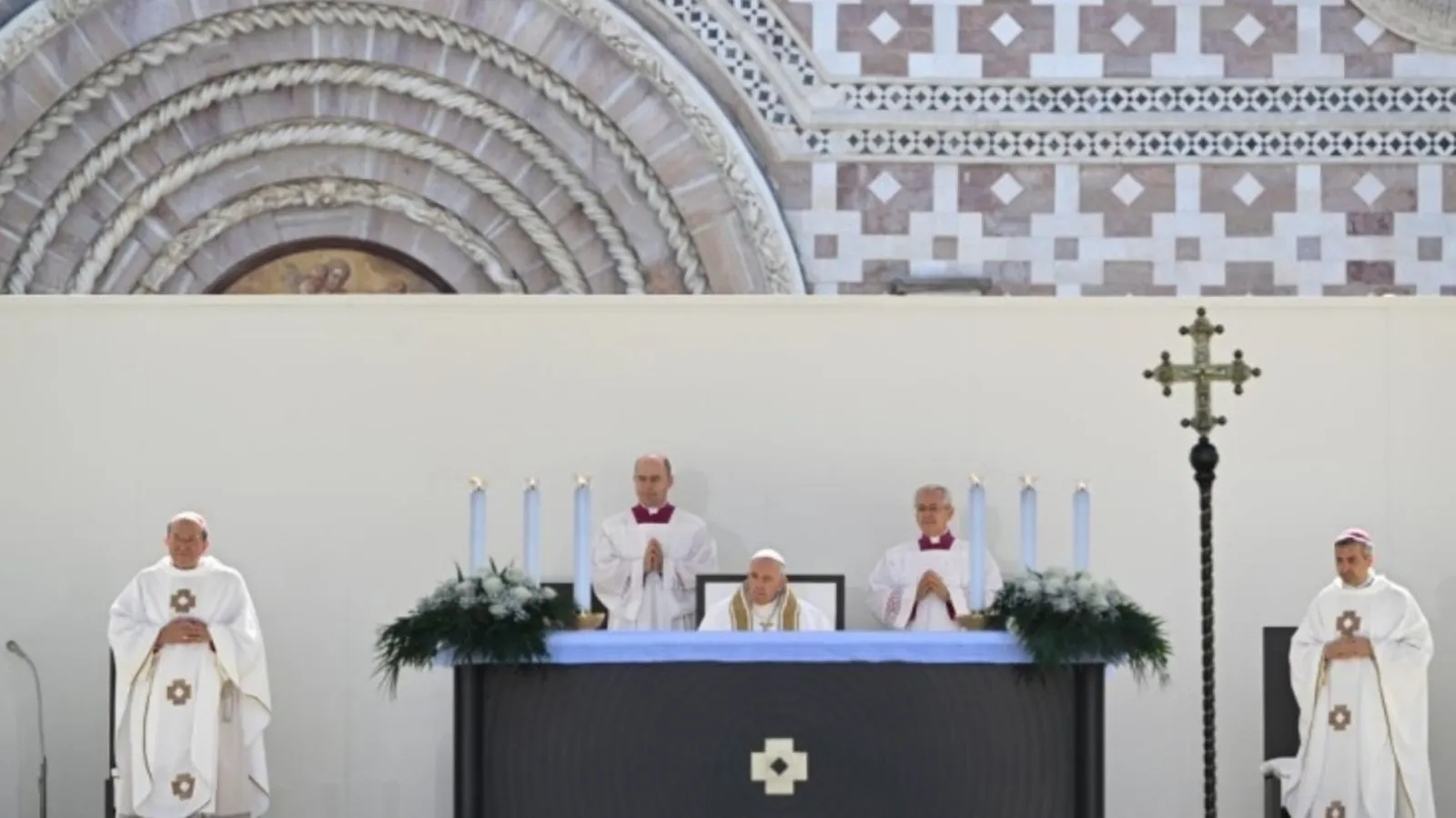 El altar para la celebración está habilitado en el atrio de la basílica, delante de la portada, en un estrado sencillo, con una pequeña cruz, una imagen de la Virgen a la derecha y, en un lateral, grandes fotos de las terribles consecuencias del terremoto.