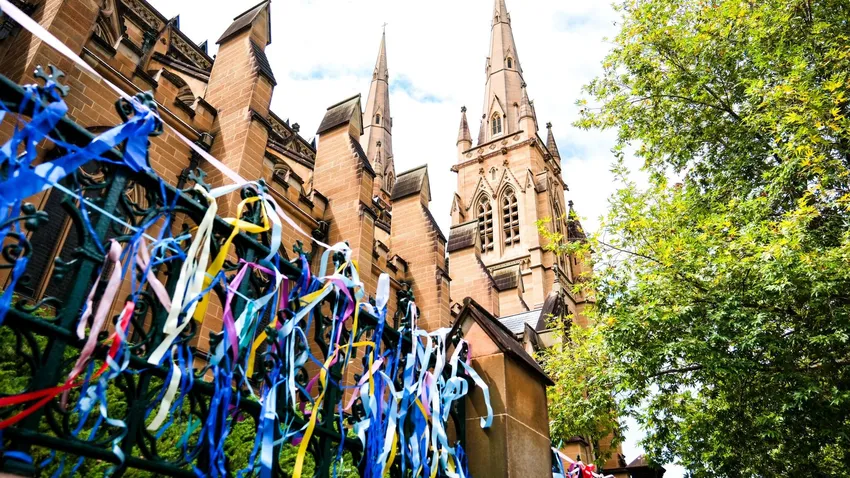 El perímetro de la catedral de St Mary de Sídney, en donde se realiza el funeral de Pell, amaneció plagado de centenares de cintas de colores como parte de una campaña impulsada por Paul Auchettl, víctima de un cura pederasta, y el activista australiano Pauline Pantsdown.