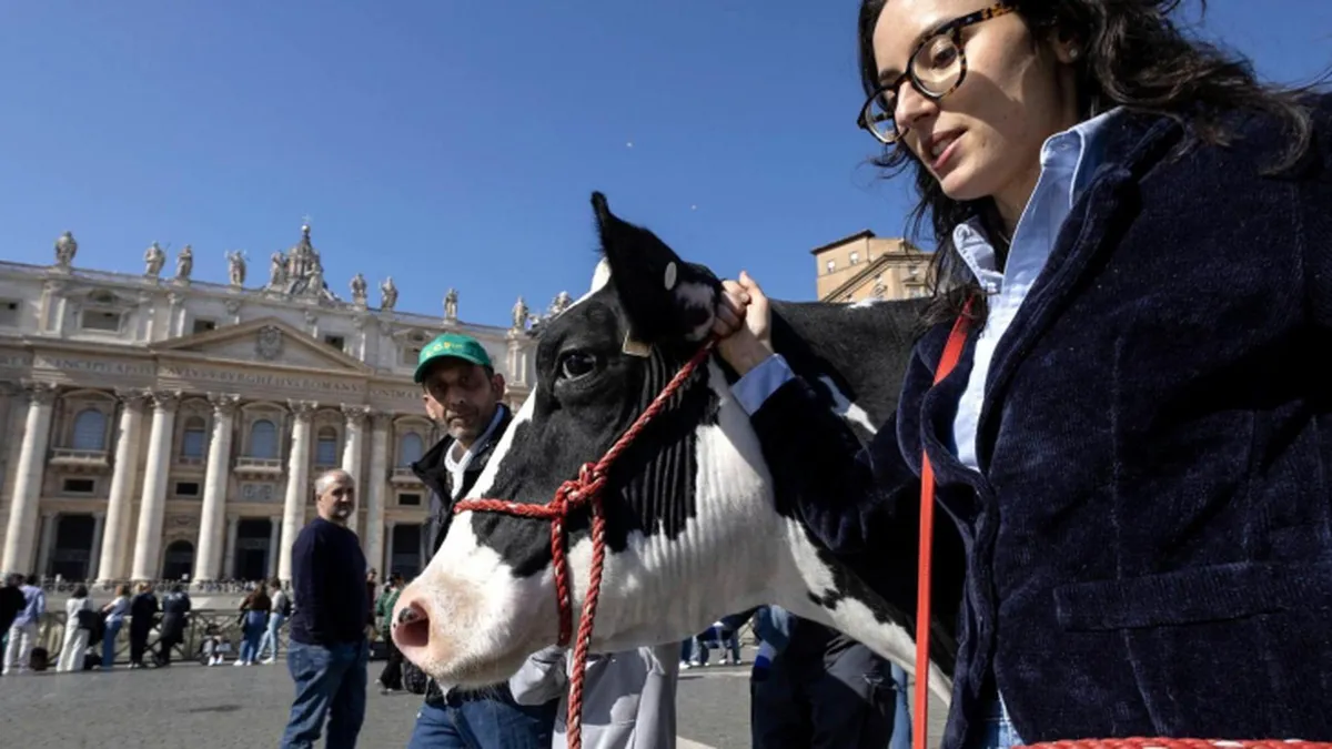 Una delegación del Movimiento Agrícola Federado (MAF) llegó hasta la plaza de San Pedro con dos de sus mayores símbolos: un tractor y la vaca Ercolina, que ya estuvo presente hace en el Festival de San Remo, el famoso certamen de la canción italiana.