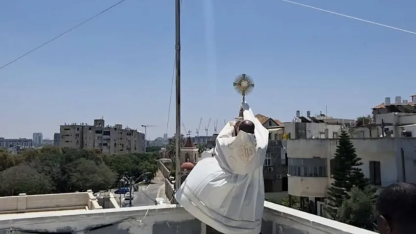 El día de la solemnidad del Corpus Christi, el padre Agustín Pelayo, párroco de la comunidad católica de Jaffa en Tel Aviv, impartió la bendición eucarística a la ciudad, alcanzada poco antes por misiles iraníes lanzados en respuesta al ataque estadounidense a instalaciones nucleares