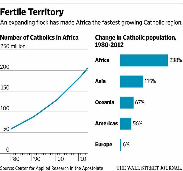 Aunque hay que reconocer que mayor parte del aumento del número de católicos en el mundo se debe al crecimiento paralelo de la población total, hay rincones donde también se ha agrandado la proporción católica de una determinada población y donde se agrandará aún más. En la África del siglo XX, por ejemplo, el censo de católicos del continente ha acrecentado de solo 2 millones en el 1900 a 200 millones hoy en día. Hay indicios, incluso, de que el número de católicos africanos podría llegar a unos 460 millones en el año 2040. Asombra el leer la conclusión de Jenkins: "Este número sería más grande que la población mundial total de católicos en el 1950".