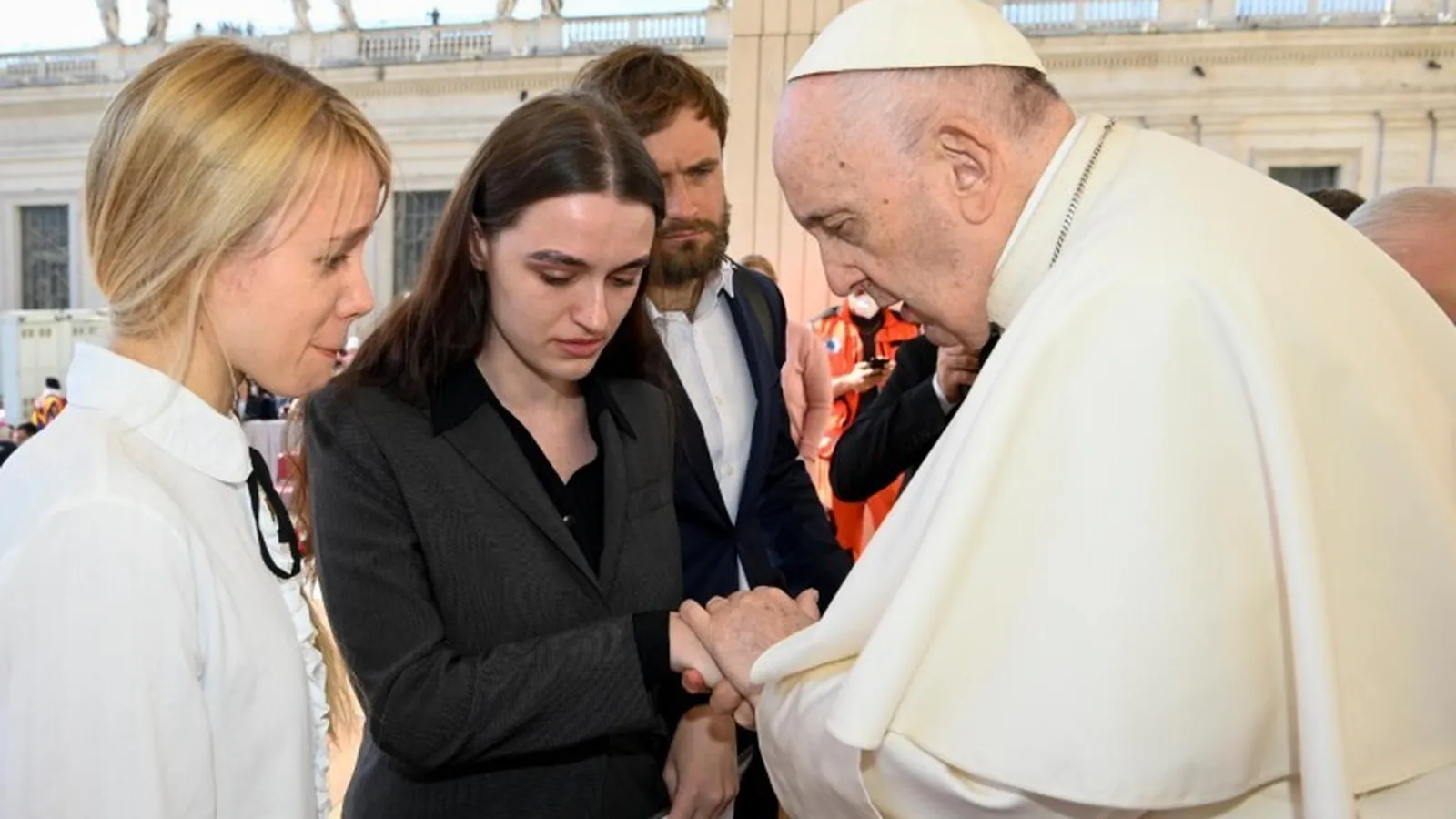Francisco saludó hoy durante unos cinco minutos, al término de la audiencia general en la plaza de San Pedro, a Kateryna Prokopenko, esposa del comandante de Azov Denis Prokopenko, y a Yulya Fedosiuk, esposa de Arseniy Fedosiuk, ambas refugiadas en Roma gracias a la Embajada de Ucrania ante la Santa Sede.
