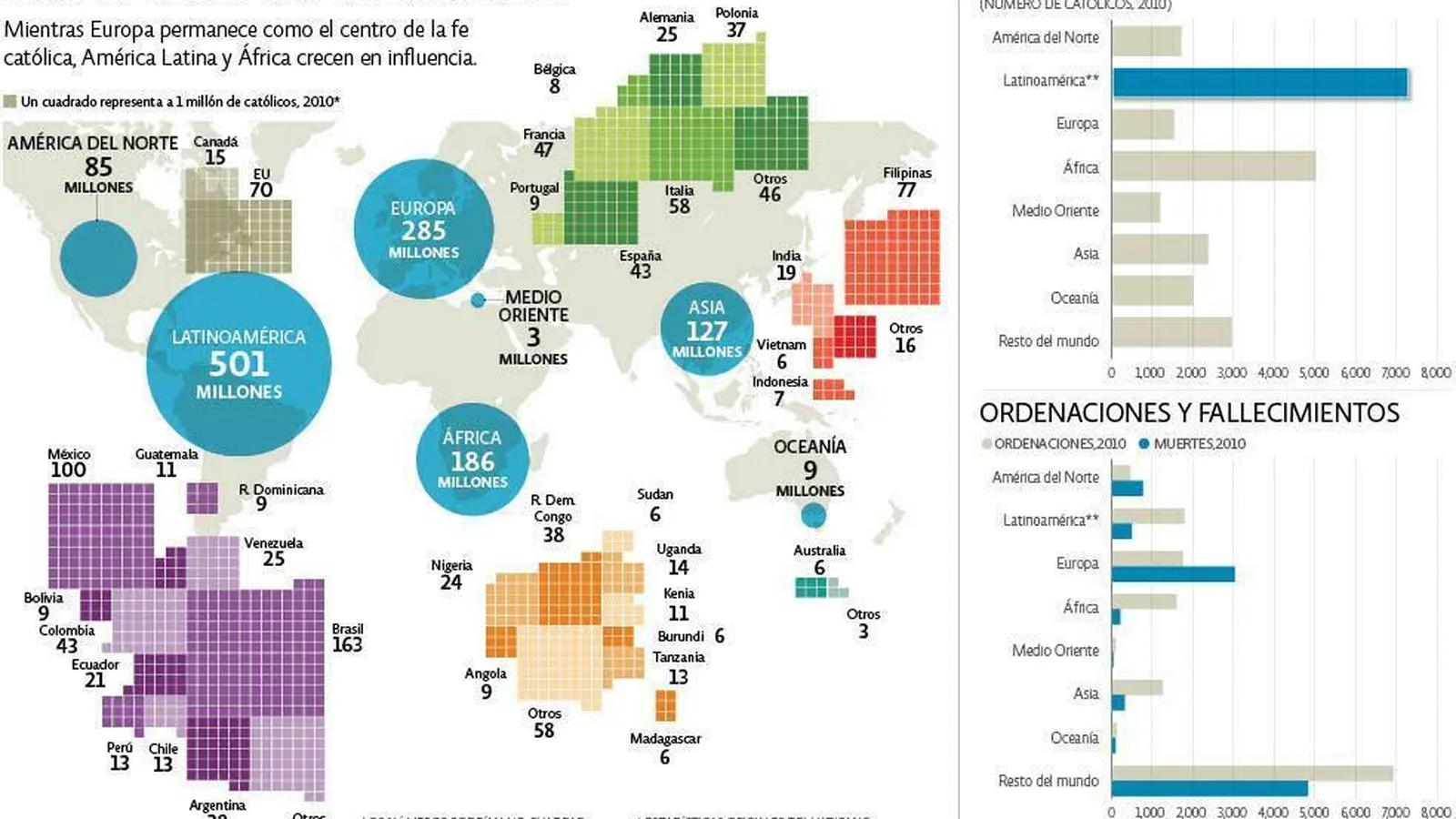 Los cuadros están tomados del último "Anuario estadístico de la Iglesia" publicado (actualizado al 31 de diciembre de 2017) y se refieren a los miembros de la Iglesia, a las estructuras pastorales, a las actividades en el ámbito de la salud, el bienestar y la educación. Entre paréntesis se indica la variación, aumento (+) o disminución (-) respecto al año anterior (2016), según la comparación realizada por la Agencia Fides.
