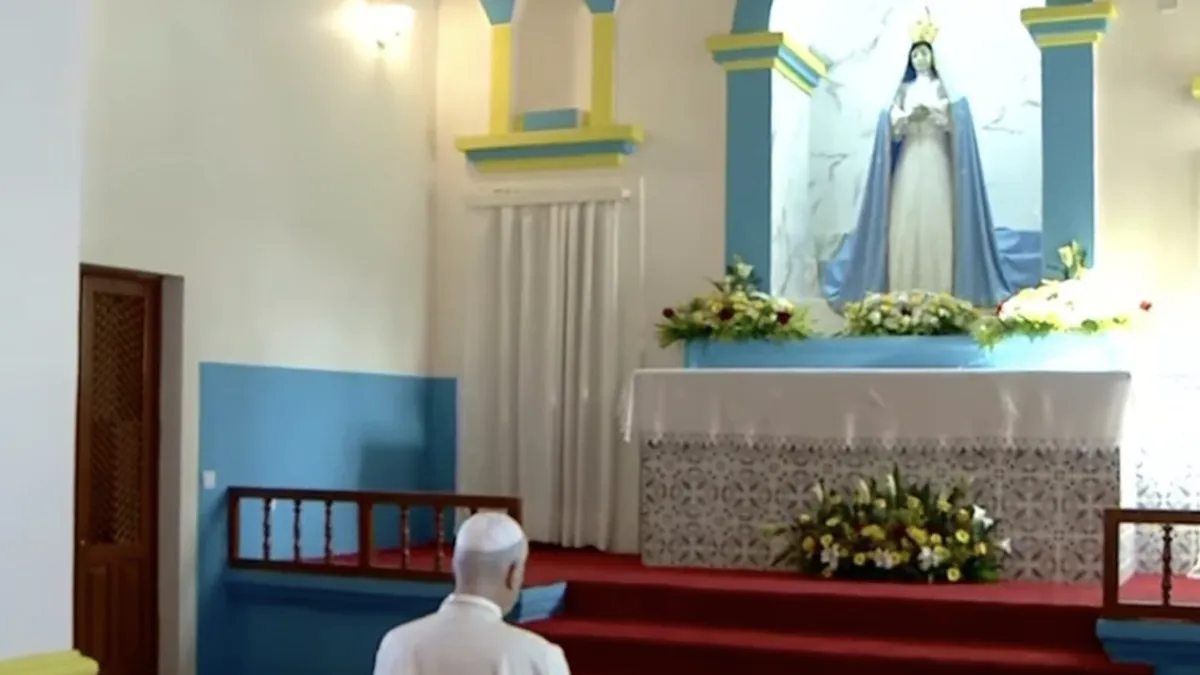 Acompañado por el obispo de Viana, Su Excelencia Monseñor Emílio Sumbelelo, el Papa León XIV atravesó la explanada y llegó al Santuario de Nossa Senhora da Muxima, donde fue recibido por el rector, quien le entregó la cruz y el agua bendita para la aspersión. A continuación, entró en el Santuario para un breve momento de oración y adoración del Santísimo Sacramento. Al término, rindió homenaje a la Virgen con una ofrenda de flores y sale para dirigirse al estrado de la Explanada.