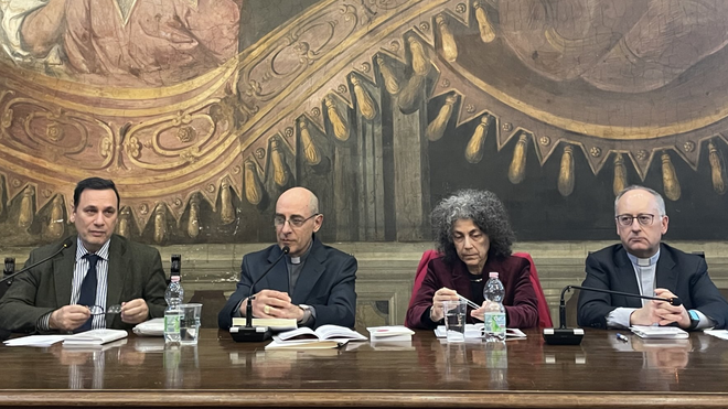 Presentación en Roma de '¡Viva la poesía!', el nuevo libro del Papa, con una mesa de postín, en la que ejercía de morador, Andrea Monda, director de L’Osservatore romano, acompañado del cardenal Víctor Manuel Fernández, de la poetisa Maria Grazia Calandrone y el propio editor del libro
