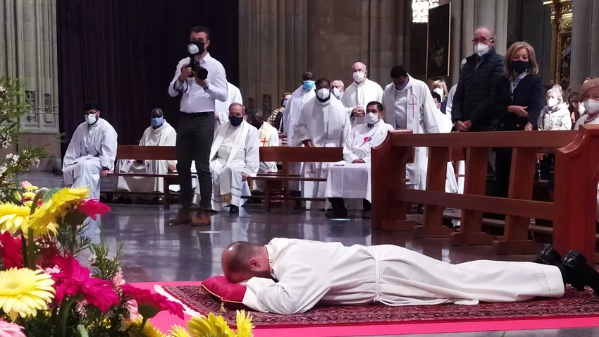 A las doce en punto repicaban las campanas de las iglesias del centro de Vitoria y con más fuerza si cabe las de la Catedral Nueva. Tras más de 6 años sin ordenaciones sacerdotales el año pasado fue ordenado Jose Antonio Vega, perteneciente al Seminario Redentoris Mater abierto en Vitoria, y casi un año después el Obispo de Vitoria vuelve a imponer sus manos sobre la cabeza de otro seminarista, Rafael Sánchez, de 32 años, convirtiéndose así en el segundo sacerdote ordenado en Vitoria bajo el episcopado de Elizalde. Sánchez es además el primer seminarista que ingresó en el Seminario Diocesano en el año 2016 tras varios años sin ninguna vocación. Hoy son casi una veintena de vocaciones.