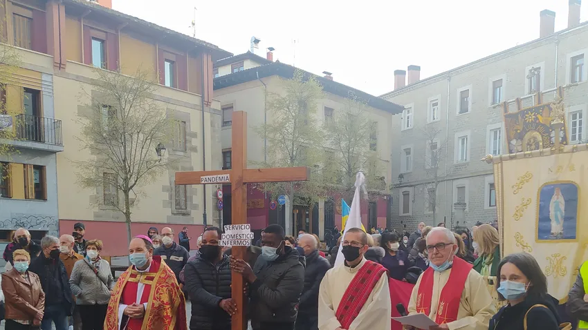 Solo las mascarillas de muchos de los participantes marcaban la diferencia en la XV edición del Vía Crucis del Mundo que organiza el Programa Berakah por las calles del Casco Viejo de Vitoria-Gasteiz y en el que participan 27 colectivos diversos, que representan a los llegados de países de Latinoamérica y África, y a las delegaciones, grupos y movimientos de la Diócesis de Vitoria. Este año, además, se suma la comunidad ucraniana que hizo suya la última estación y el final del Vía Crucis en el interior de la Catedral Vieja de Santa María.
