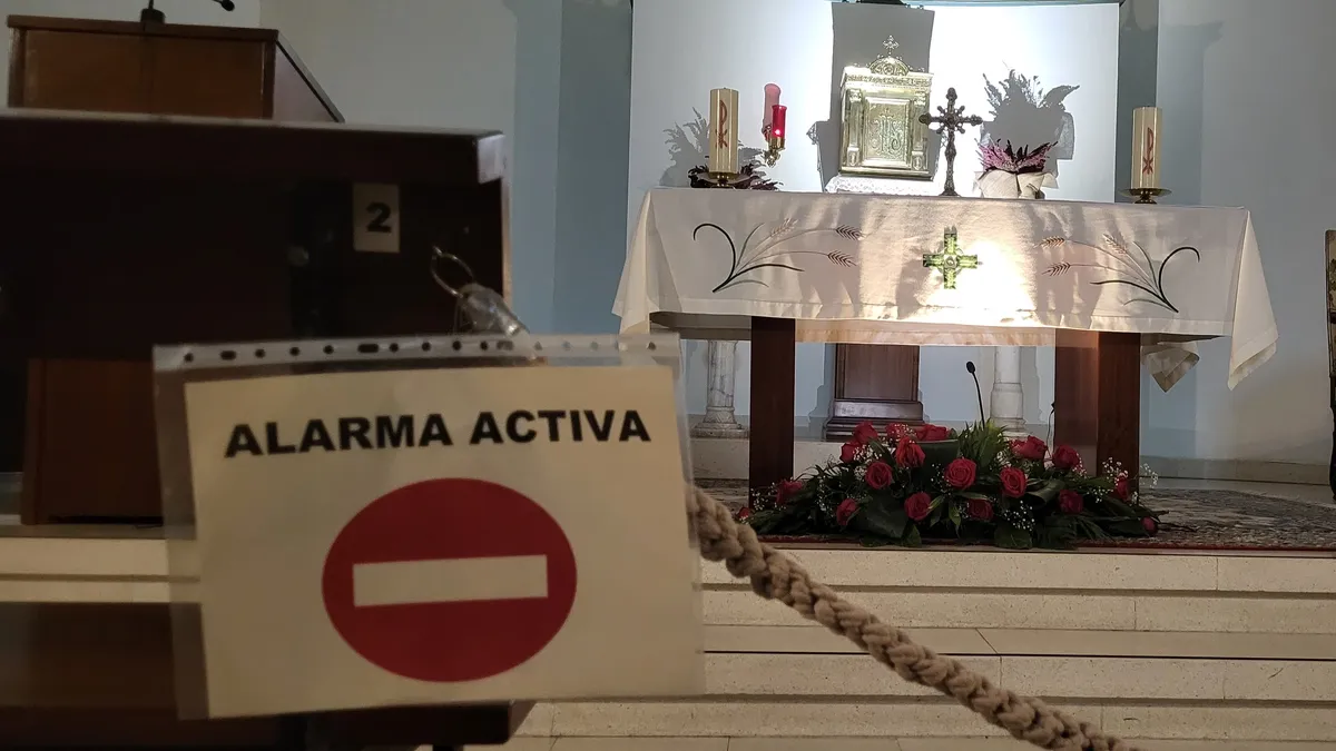 El otro día paseando entré en una preciosa y coqueta iglesia de mi ciudad y a pie del presbiterio me encontré con el cartel que aparece en la foto. Sí, ya sé que está puesto para evitar robos de objetos sagrados o incluso algún acto vandálico o sacrílego, que siempre puede haber algún idiota que pensando en hacer daño a la Iglesia se mete con quien más le ama. Pero mientras estaba sentado en los bancos de esta iglesia me ha venido a la cabeza un pensamiento que no he podido evitar y que comparto.