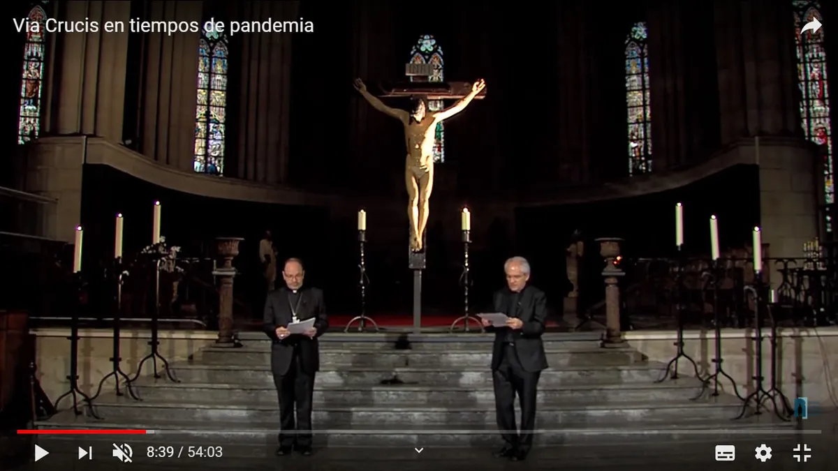 En este Viernes de dolores la Diócesis de Vitoria ha ofrecido a través de sus canales de comunicación el Via Crucis desde la Catedral Nueva de María Inmaculada. Juan Carlos Elizalde, obispo, y Carlos García Llata, Vicario General, ofrecían, flanqueando al cristo crucificado, una sencilla imagen. La imagen de una Diócesis confinada en sus casas. Solo seis personas, que su labor diaria les autoriza a interrumpir el confinamiento, han acompañado, representando a toda la comunidad cristiana diocesana. En cada estación una reflexión y el recuerdo a todos, porque todos estamos afectados por las consecuencias de la pandemia, pero con mención específica en cada estación a las personas que mantienen el servicio en los centros sanitarios, a los que velan por la seguridad de todos, a quienes afrontan el futuro con preocupación en lo laboral, en lo económico, por los migrantes, los más vulnerables, los que han sido golpeados directamente por la enfermedad, por las víctimas que no pudieron superarla y sus familias.