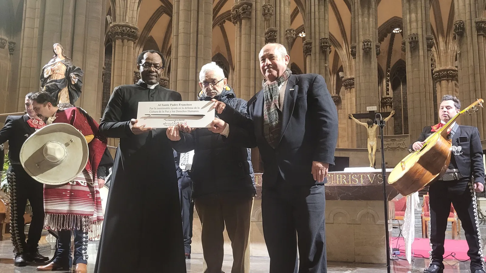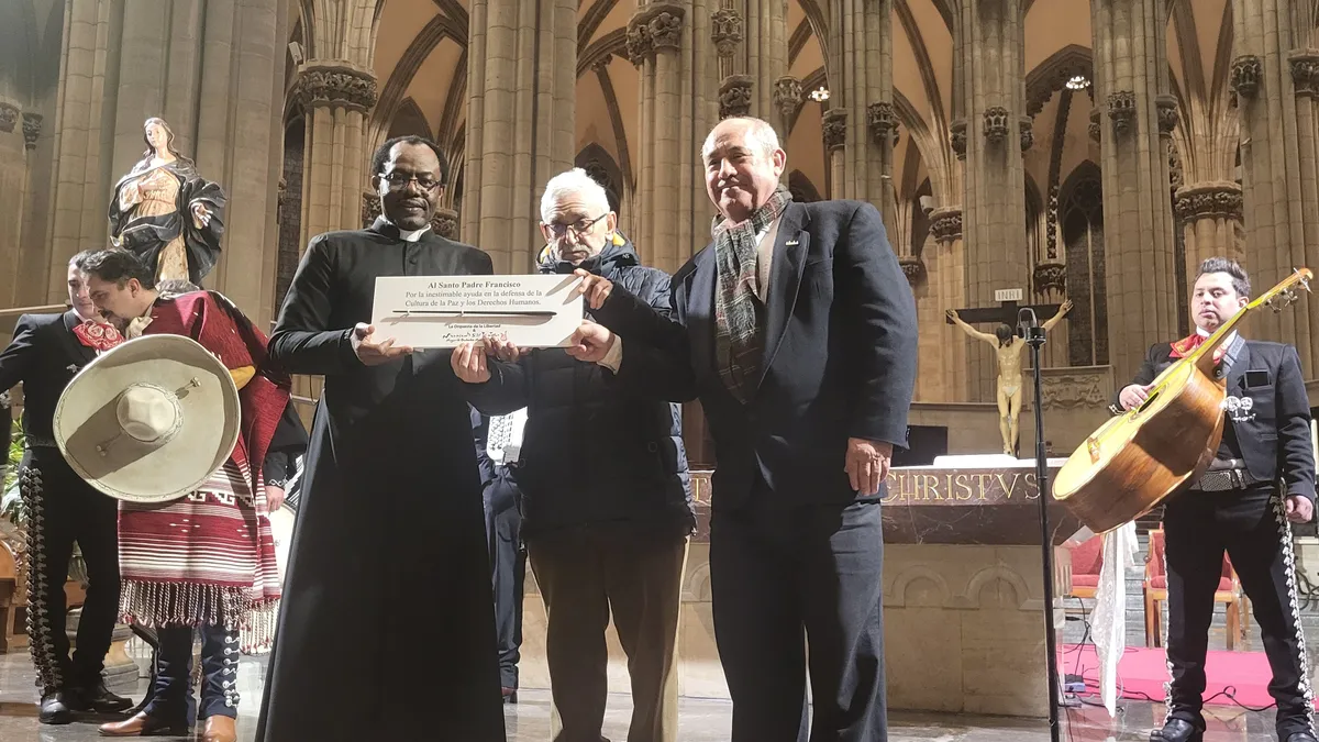 El presidente de Músicos sin Fronteras, Jesús Mari Alegría, Pinttu, explicó al principio la labor de esta organización y al final del concierto hizo entrega de la batuta de la Orquesta de la Libertad para el Papa Francisco. Recogió esta distinción Cristian, sacerdote de la Catedral que, en nombre del obispo, Juan Carlos Elizalde, que excusó su ausencia por motivos pastorales, asumió el encargo de hacerle llegar al Santo Padre este reconocimiento.