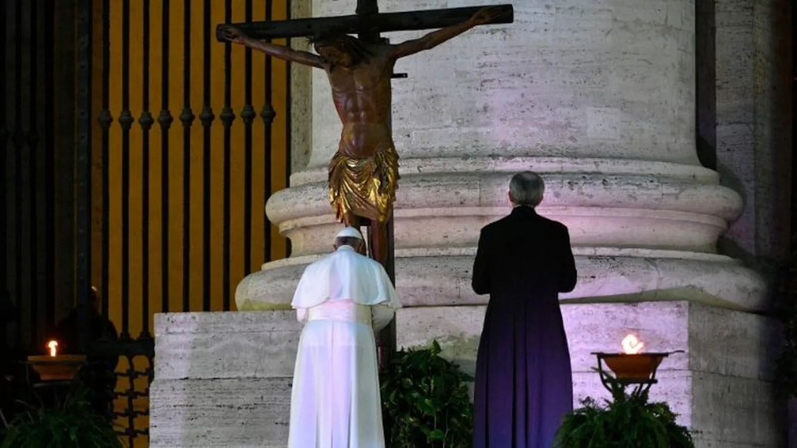Ese Cristo Crucificado que sobrevivió al fuego, que los romanos llevaron en procesión contra la peste; ese Cristo Crucificado que San Juan Pablo II abrazó durante la liturgia penitencial del Jubileo del 2000, fue el protagonista silencioso e inerme en el centro del espacio vacío.