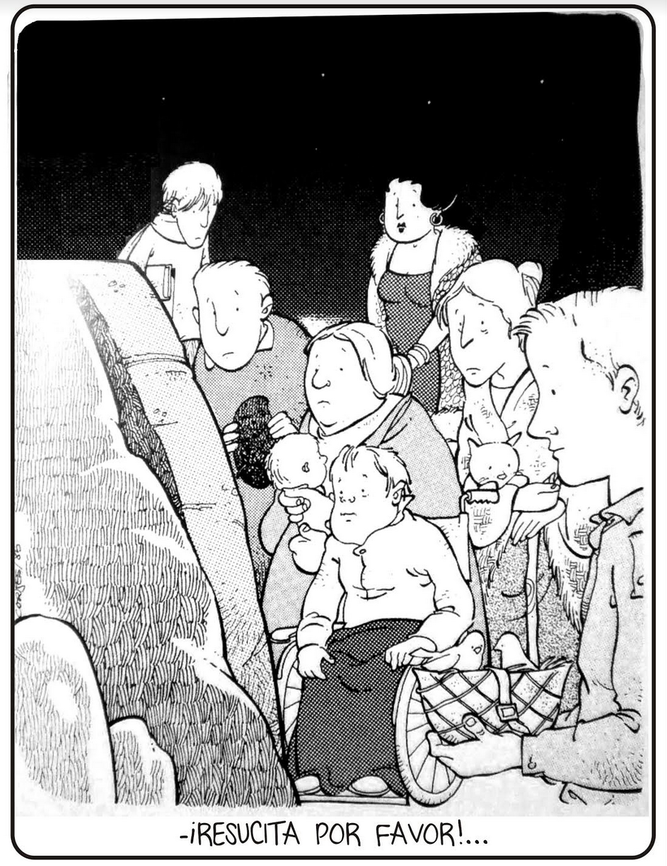 Pero aquí estamos, como lo grafica magistralmente J.L. Cortés en una de sus viñetas: los desahuciados, los ancianos, las prostitutas, los lisiados, los don-nadie, los sin techo y sin trabajo, frente al sepulcro, con los ojos fijos y mendigando con la mirada: “¡Resucita por favor!” Brota como un gemido tenue; como una necesidad y un anhelo que surge desde el fondo del corazón de todos los desesperanzados que todavía esperan que la muerte, los victimarios y la injusticia no tengan la última palabra. Porque esas tres grandes cuestiones que marcan desafiantemente la historia humana claman por alguna razón positiva que permita creer que la esperanza no es un mero voluntarismo ciego que va sembrando la vida de mil promesas falsas.