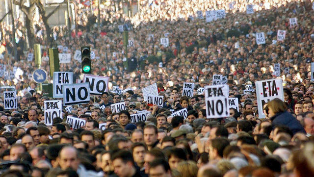 ETA y su mundo han escrito la página más negra de la historia del pueblo vasco. Lo subrayé en 2014 en mi libro, "Tras la losa de ETA". Además, pretendían hablar y actuar en nuestro nombre, en pro de la liberación "social y política" del pueblo vasco. ¡Cómo olvidar, lo repito, aquellas concentraciones en silencio, muchas de Gesto por la Paz, cuando nos gritaban a voz en grito, a un palmo de nuestras narices, aquello de "los asesinos llevan lazo azul", "hoy, tú de negro; mañana, tu familia", "zuek ere txakurrak zarete" (vosotros también sois perros. El termino txakurra= perro lo utilizaba la izquierda abertzale para designar a los miembros de la Policía Nacional y de la Guardia Civil), y sobre todo, el terrorífico "ETA, mátalos", sin que todavía se hayan desdicho y, sobre todo, no hayan pedido perdón a todas sus víctimas y a la ciudadanía vasca por haber ensuciado de ese modo la historia y la convivencia de este pueblo!. Muchos lo han dicho con razón: a la izquierda abertzale le falta hacer un juicio ético de sus apoyos callejeros primero y de sus silencios después, de las acciones de ETA. Al menos una vez, de forma clara, en uno de sus Congresos. Nos lo deben.
