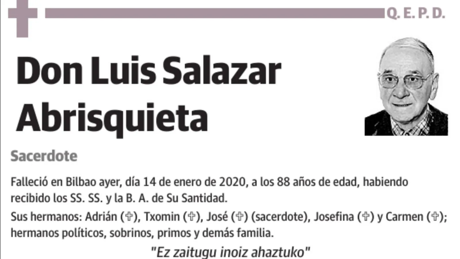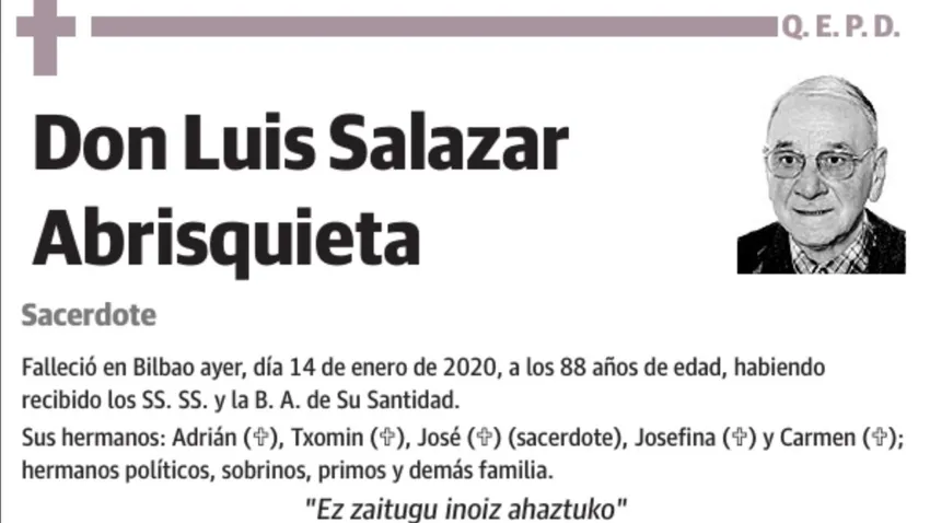 De vez en cuando recordaba cómo su aita era un hombre sencillo, que se levantaba muy de mañana, cogía el tren en Arrancudiaga para ir a trabajar y llegaba a la noche derrengado a casa para sacar a delante a la familia y volver a empezar al día siguiente. La referencia de su aita, persona discreta, trabajadora y eficaz presidió su vida y creo que explica esta preferencia que tuvo Luis con la gente de parecido perfil, gente a la que los medios de comunicación y los amantes de lo exótico, indiscreto y paranormal (tan al uso en algunos medios) no quieren conocer y no se molestan en tener presente, pero que son fundamentales en nuestros pueblos, familias y en la Iglesia.