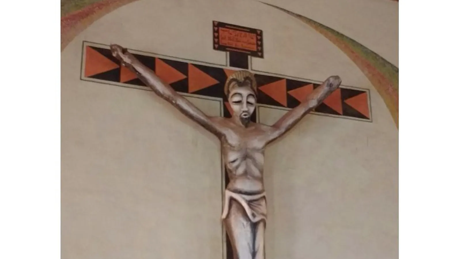 Tengo el gusto de presentaros a nuestro Jesús crucificado de la catedral de Bangassou. Aquí llevamos 5 años de guerra civil a baja intensidad. Tantos y tan malos, que nuestro Jesús se cubre el rostro, se pone una máscara que esconde sus ojos de dolor por la miseria que es una guerra y lo míseros que son los que la hacen y la pagan en moneda extranjera. Es una máscara africana que deja ver sin mostrar el rostro. Un mirar oculto típico de la filosofía africana, que aun con los ojos cerrados, Cristo está bien cerca de su pueblo y lo compadece con su mirada.