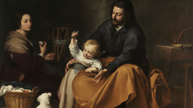 Murillo nos representa al niño Jesús sostenido con cariño por su padre putativo mientras, agarrando en sus manos un pajarito, distrae al perro del hogar ante la atenta mirada de su madre. Los utensilios de la habitación, los colores que la acompañan, la humildad de las telas y las ropas…nos transportan a una casa pobre de la Sevilla del propio autor, al hogar de algún carpintero humilde que en la España de los últimos Austrias luchara por sobrevivir entre el frío y la quiebra de la Monarquía.