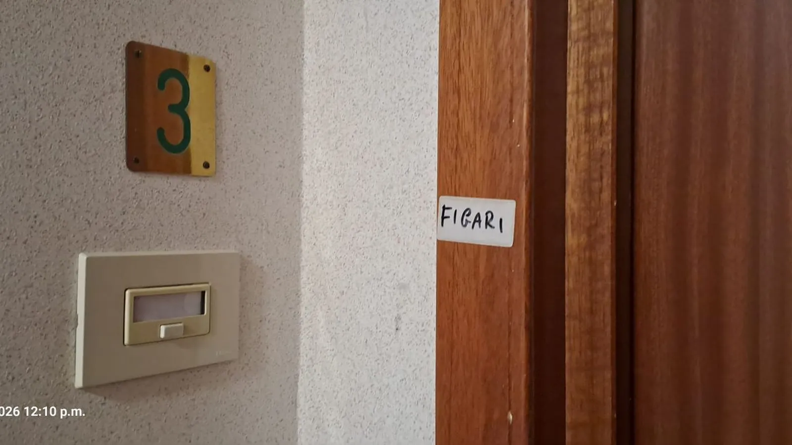 El italo-peruano Figari está en “Palazzina Ricci”, primer piso. Nos indicaron el camino. Al llegar, encuentras un letrero que dice “Figari”. Tocamos el timbre. La persona que lo cuida, que habla español, nos abrió y autorizó el ingreso.