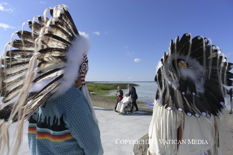 Francisco participó hoy del tradicional peregrinaje al lago Santa Ana, unos 80 kilómetros al noroeste de Edmonton, en donde bendijo los 54 kilómetros cuadrados de la superficie del espejo cuya agua es conocida hace años por sus supuestas propiedades curativas.