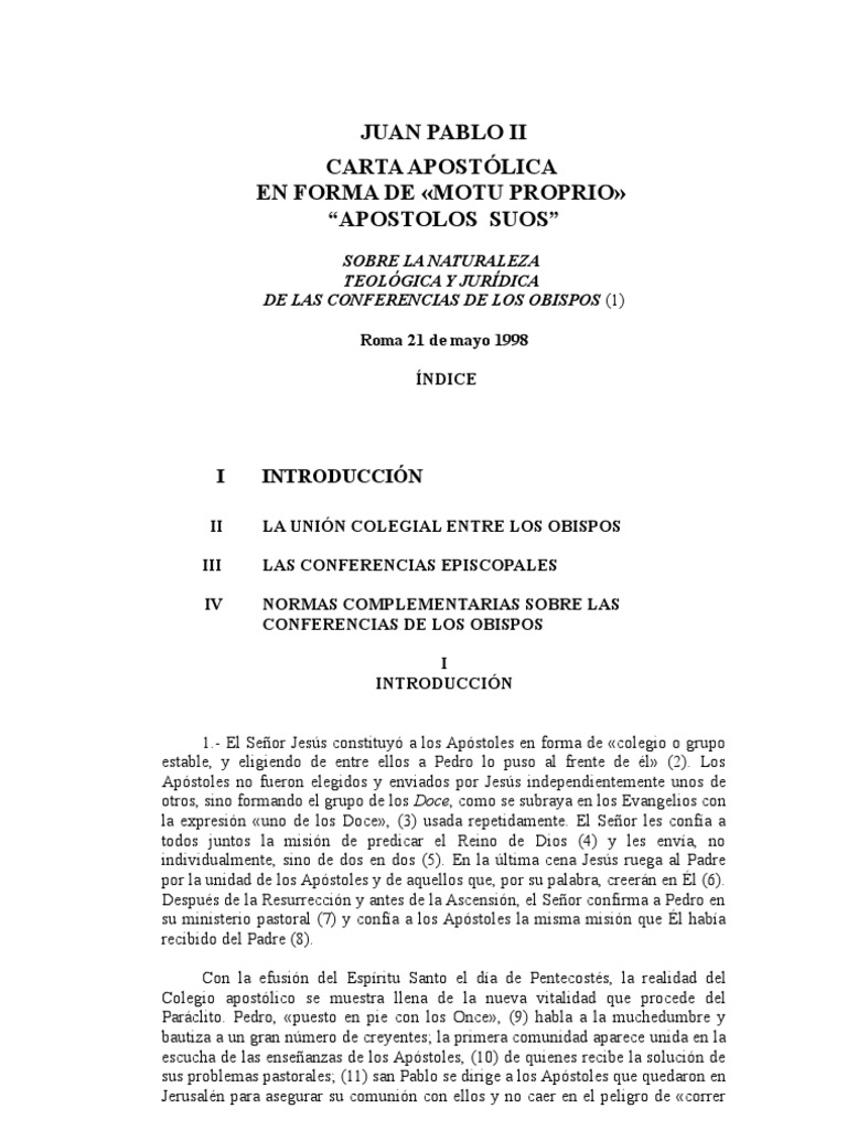 Pasados diez años -y renovada ya una buena parte de la Conferencia Episcopal en EE.UU y en el mundo, en conformidad con los modelos de obispo e Iglesia promovidos por Juan Pablo II- el Papa da a conocer el 23 de julio de 1998, mediante el “Motu proprio” o Carta Apostólica “Apostolos suos” “sobre la naturaleza y los límites de la autoridad de las Conferencias Episcopales”, lo adelantado por el cardenal Gantin diez años antes: queda negada, de manera práctica, pero no teóricamente, la capacidad de emitir magisterio auténtico a los obispos; algo que, curiosamente, les reconocía el mismo Código de Derecho Canónico de 1983 en su número 753.