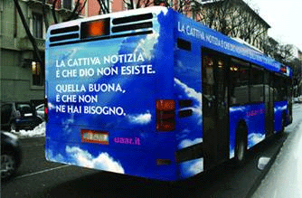 ateos italianos, siguiendo el ejemplo de británicos y españoles, anunciaron este lunes una campaña de publicidad que buscará afirmar la no existencia de Dios y que comenzará el 4 de febrero en dos autobuses de Génova, bajo el auspicio de la Unión de Ateos y Agnósticos Racionalistas (UAAR) de Italia.