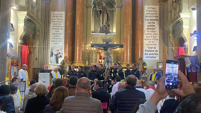 Como el sufrimiento, pero también como la esperanza, que siempre llegan, aunque en ocasiones con algo de retraso. La parroquia '24 horas' de San Antón acogió este Viernes Santo un cortejo procesional presidido por la el Cristo de los Niños, una talla del siglo XVII que fue portada por los Bomberos de Madrid. Junto al padre Ángel, el cardenal de Madrid, Carlos Osoro, y Blanca Pinedo, en representación del alcalde Almeida. Presidiendo el paso, varios menores, hijos de colaboradores de Mensajeros de la Paz y, también, pequeños refugiados del horror de la guerra de Putin.