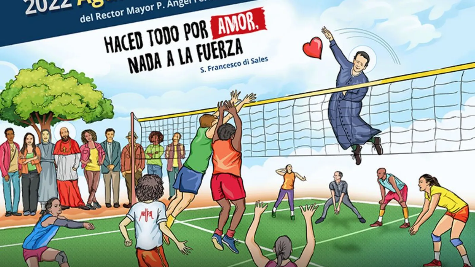 Al fondo, testigos del intercambio de amor inspirado por Don Bosco entre los dos equipos opuestos, sonríen San Francisco de Sales, algunos jóvenes, un salesiano y una Hija de María Auxiliadora, apoyados en un árbol alimentado por la misma esperanza que alimenta a toda la Familia Salesiana.