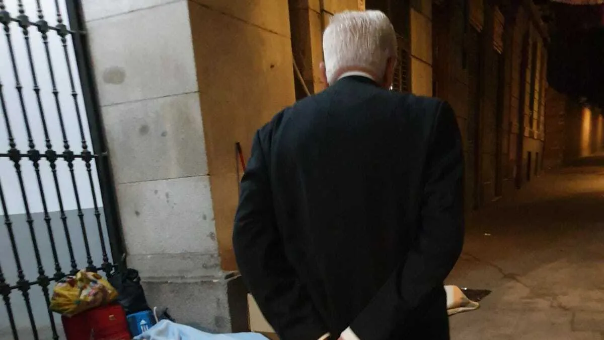 El Padre Ángel, Presidente de Mensajeros de la Paz, visitó anoche la Plaza Mayor de Madrid para solidarizarse con la situación de las decenas de sintecho que duermen en sus soportales desde hace más de dos años.