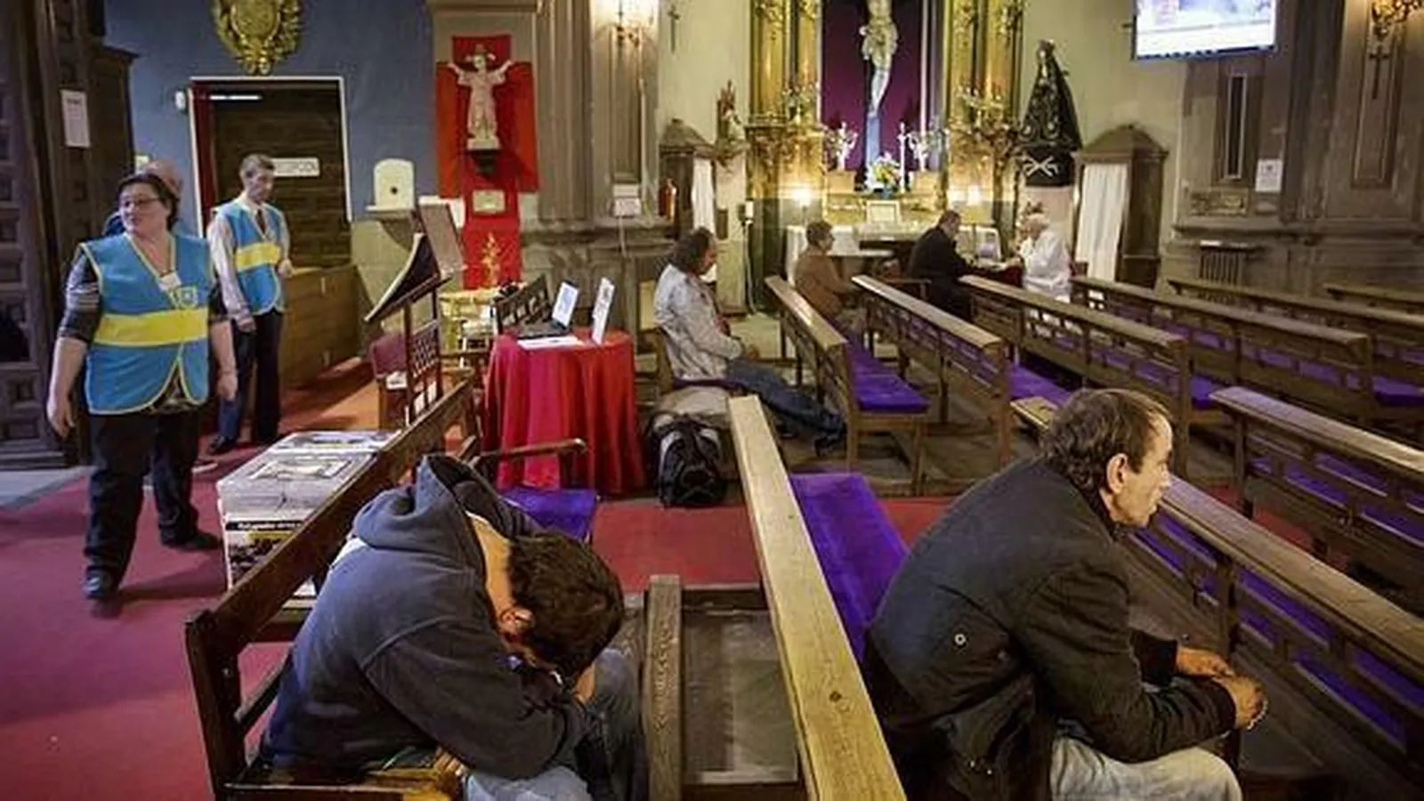 Los cuadros estarán colocados en el suelo para que las personas que la visiten se vean obligadas a bajar la mirada donde normalmente están las personas sin hogar en la calle. En las pantallas de la iglesia, se proyectará la exposición fotográfica de Álvaro Fuentes que con su habitual maestría ha plasmado instantáneas, anteriores a la pandemia, que retratan cómo era la iglesia de San Antón cuando daba cobijo a las personas sin hogar. El cardenal y el padre Ángel recorrerán ambas exposiciones después de dar los desayunos desde la ventanilla de San Antón que da a la calle Hortaleza.