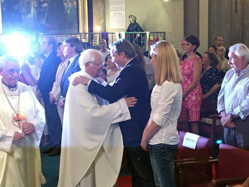 Durante el rito de la Paz, abrazos y guiños cómplices del Padre Ángel con Carmena, Carmona, Cifuentes y Gabilondo. Al final de la misa, se leyó la bendición papal y se tuvo un recuerdo emocionado al padre José María Valero, el cura abuelo recientemente fallecido.