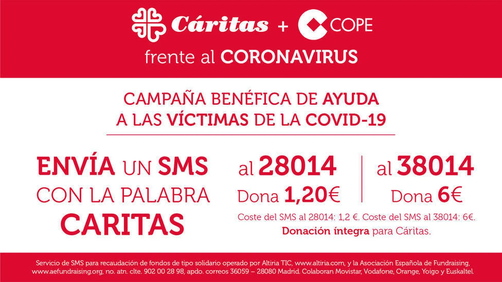 Esta iniciativa de Grupo COPE permanecerá activa desde este lunes para atender a las personas afectadas por la COVID-19 y se difunde a través de radio, televisión e internet. El coste del SMS al 28014 es de 1,20 € y el coste del SMS al 38014 es de 6€. La donación es íntegra para Cáritas. Asimismo, este servicio de SMS para recaudación de fondos en campaña de tipo solidario está operado por Altiria TIC, www.altiria.com, y por la Asociación Española de Fundraising, www.aefundraising.org, número de atención al cliente 902 00 28 98, apartado de correos 36059 – 28080 Madrid. Colaboran Movistar, Vodafone, Orange, Yoigo y Euskaltel.