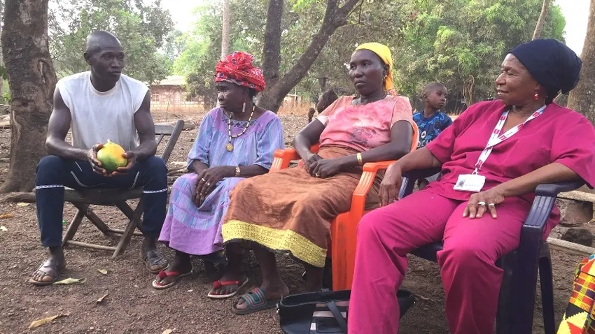 La doctora Anna Cirera junto a Josua Sandy, enfermero del St. John of God Hospital de Lunsar, en una reunión con líderes locales en la comunidad de Mende, distrito de Port Loko.