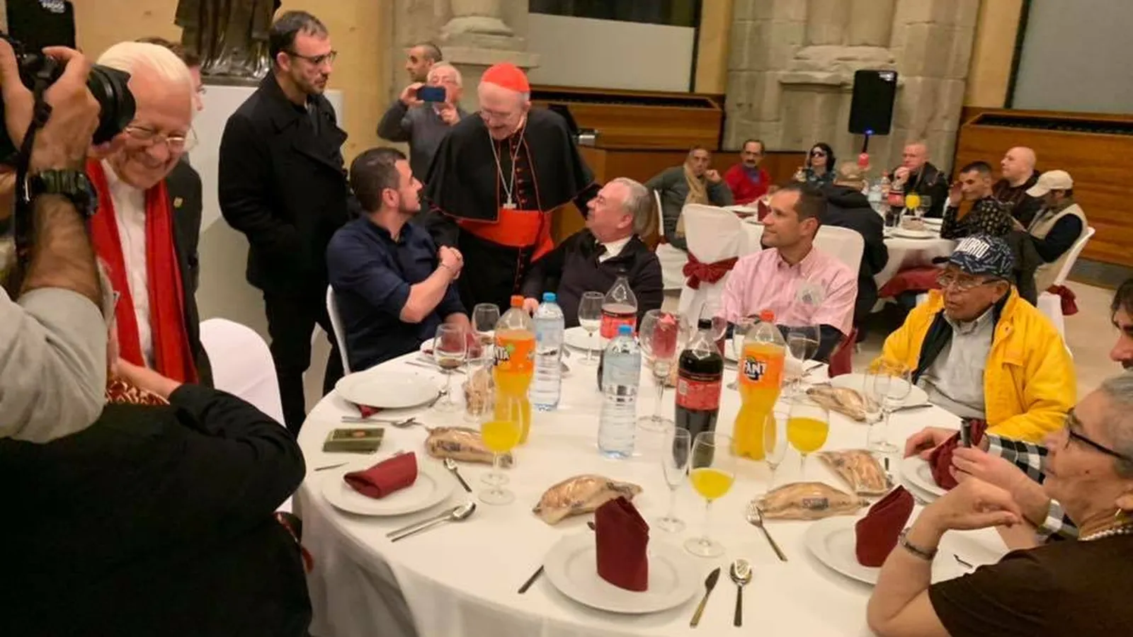 Hace cuatro años, en la Nochebuena de 2018, los pasillos del claustro de los Jerónimos se abrieron para los más pobres de entre los pobres, los sin techo. Más de doscientas personas pudieron disfrutar de una cena de lujo, servida por Martín Berasategui, gracias a la iniciativa de Mensajeros de la Paz. El padre Ángel, que ya ha llevado a sus 'feligreses' de San Antón a cenar al Ayuntamiento o al Senado, quiso que también pudieran disfrutar, el día del nacimiento de Jesús, de los mismos lujos que, cuatro años después, se le dieran a los poderosos.