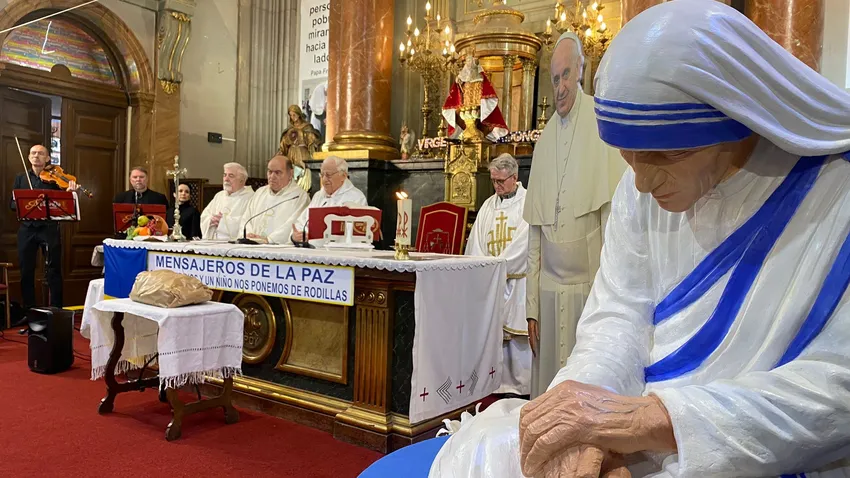Nada mejor (porque, aunque muchos quieran olvidarlo, el pater es sobre todo cura) que hacerlo que en una misa de acción de Gracias en el templo de la calle Hortaleza. Junto a la efigie del Papa Francisco, junto a la estatua de Madre Teresa. Desde el altar, y observando los rostros de los 'otros santos' (Pablo VI, don Gabino, Vicente Ferrer, Casaldáliga...) el padre Ángel agradeció, visiblemente emocionado, la presencia de todos
