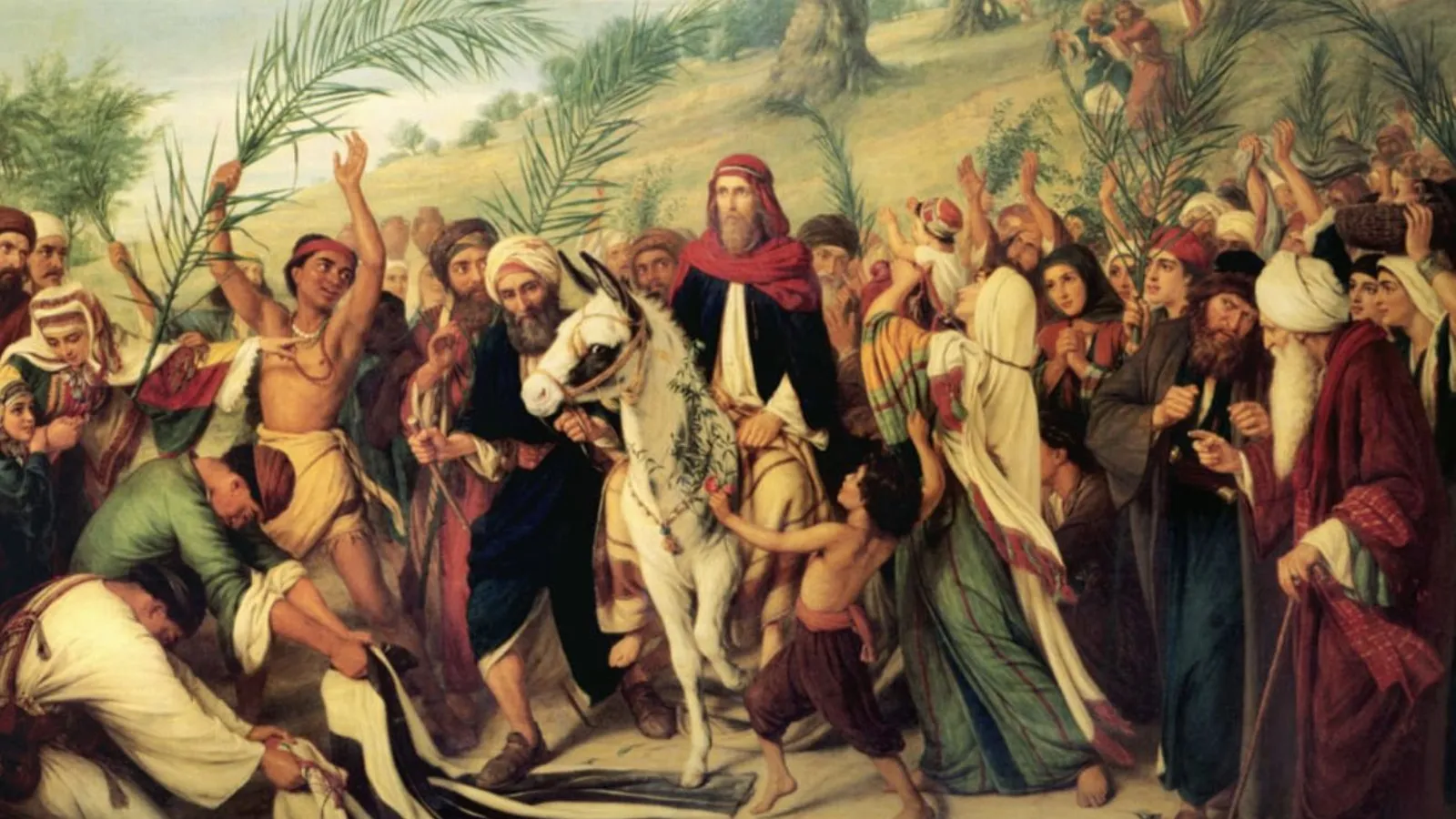 Y los dos, con el potro a cuestas, llegan a Jesús. Todo sigue un guión que desconocemos. Los dos tiran sus mantos encima porque el animal no tenía aparejos. Jesús se sube encima. He aquí la instantánea: Jesús sentado sobre un potro adornado con mantos. La escena no nos dice mucho. Pero solo porque somos ignorantes y no conocemos las antiguas palabras del profeta Zacarías pronunciadas alrededor del 520 a. C. cuando reinaba Darío I en Persia, en la época del regreso de los judíos de la cautividad. Aquí están en su poesía visionaria: «¡Alégrate mucho, hija de Sión, regocíjate, hija de Jerusalén! He aquí que tu rey viene a ti. Justo y victorioso es él, humilde, cabalgando sobre un asno, un pollino, hijo de asna. Quitará de Efraín el carro de guerra y de Jerusalén el caballo, el arco de guerra será quebrado, anunciará la paz a las naciones, su dominio será de mar a mar y desde el Río hasta los confines de la tierra».