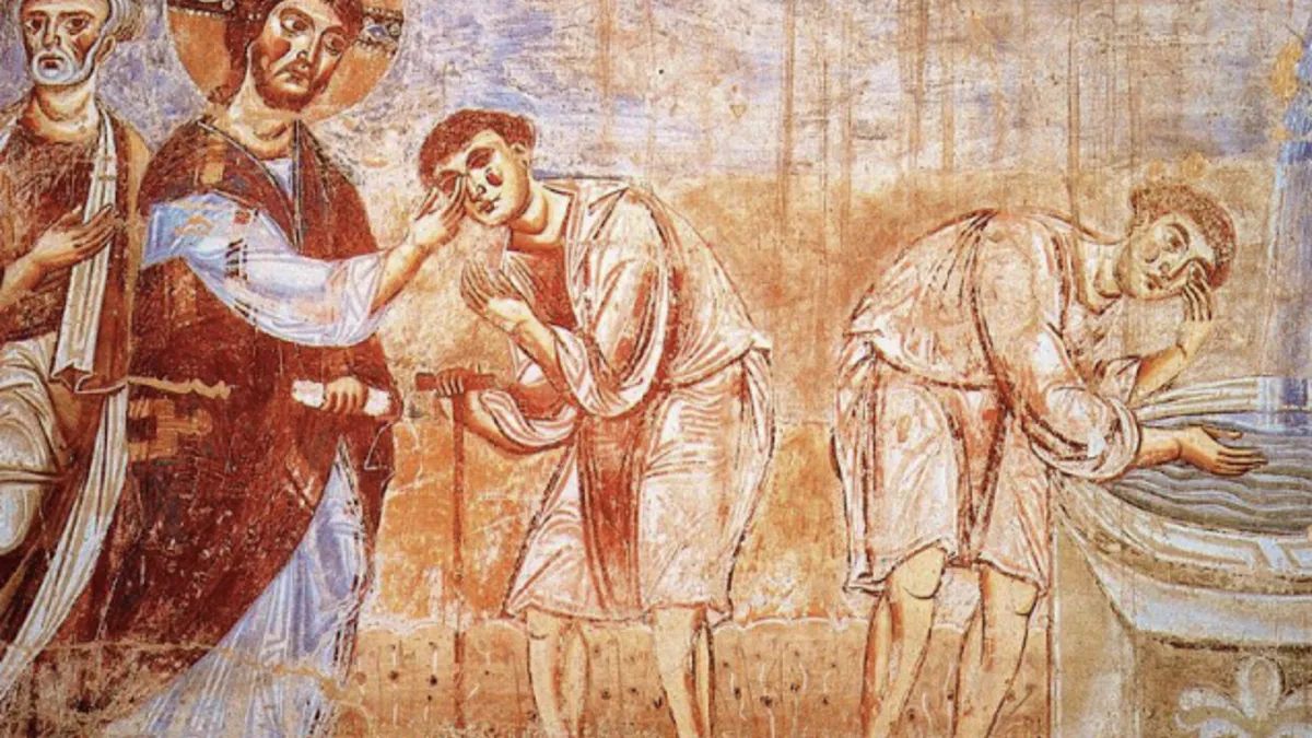 Jesús se inclina, escupe, hace barro y lo unta en los ojos del ciego. Es un gesto tosco, hecho de saliva y polvo. Nada sagrado. La luz de la escena cae sobre manos sucias y cuerpos reales. Jesús no tiene instrumentos de curación: toca. «Ve a lavarte a la piscina de Siloé», le dice. El hombre se va. Todavía no ve el mundo mientras camina: ¿alguien lo acompaña? Vuelve viendo.