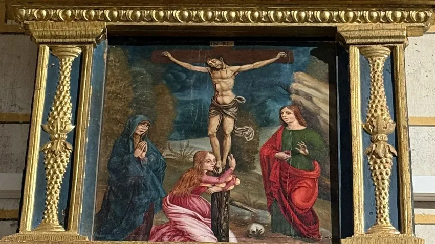 Jesús está en la cruz, expuesto. Clavado, ya no actúa: reacciona. La cruz es fija, inmóvil. Pero todo a su alrededor se mueve: las palabras, los cuerpos, las miradas. Es el mundo que lo mira, lo mide, lo juzga. Junto a él, otros dos crucificados. Él es «contado entre los malhechores». Jesús es confundido con los culpables. Su cruz no se distingue. Es una de las tres, aunque está en el centro. Parece una nota de arquitectura.