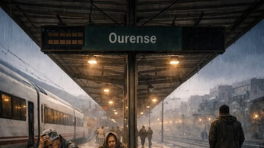 Los vagones de nuestro Alvia procedente de Coruña se fueron vaciando. Cerré el libro que me mantenía fuera del mundo y sus raíles y temí lo peor. No daba crédito a que me habría de separar de ese confortable asiento calefactado. El tren no continuaba. De repente nos vimos desamparados en una ciudad desconocida, Ourense, sin saber qué hacer. Eran las nueve de mañana del 11 de febrero. Llovía a mares y hacía frío.