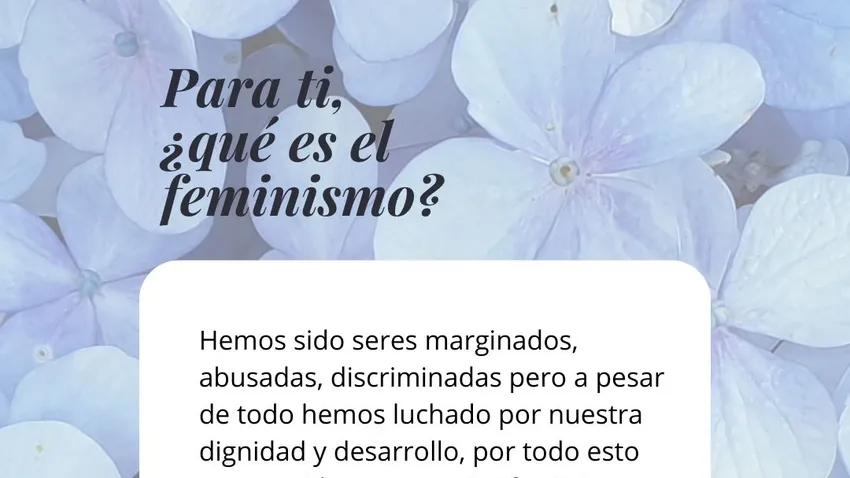 En primer lugar ser mujer en toda sociedad siempre ha sido un tremendo desafío para la sobrevivencia, hemos sido seres marginados, abusadas, discriminadas pero a pesar de todo hemos luchado por nuestra dignidad y desarrollo, por todo esto me considero una mujer feminista, pues creo que todo ser humano no importa su color, raza u origen tienen los mismos derechos que tienen los hombres' Ser feminista para mi es solidarizarme con aquellas que son violentadas, oprimidas y discriminadas, por lo menos levantando la voz en su defensa.