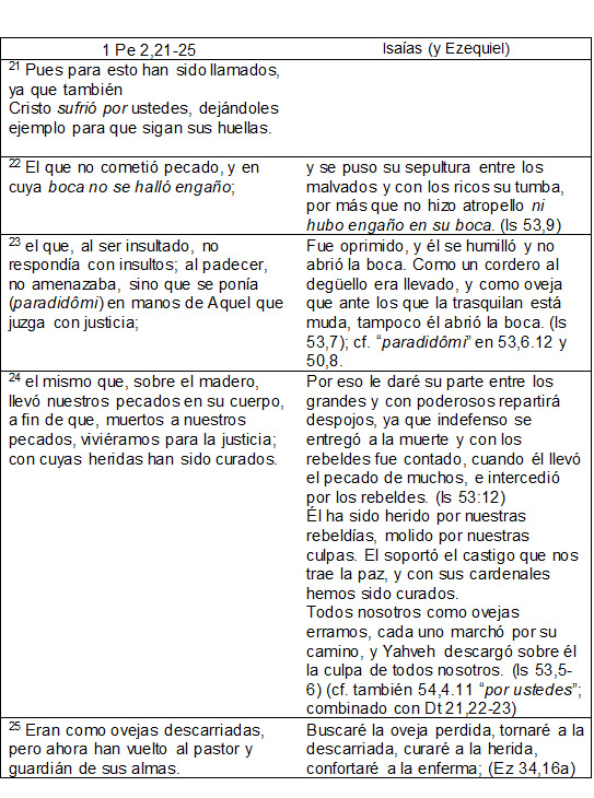 El texto litúrgico de hoy corresponde (con la exclusión de la presentación del destinatario, vv.18-20a) a lo que se dice a los “esclavos”, aunque aquí no se use el habitual “doulos” sino que se dirija a los “domésticos” (oikétai). Es claro que al omitirse esta referencia parece dirigirse a “todos los cristianos”. El sufrimiento al que se alude se refiere (v.18b) al provocado injustamente por los amos severos. El texto –dirigido a cristianos en situación de desprecio, rechazo (“extranjeros”) compara la situación que viven en las ciudades del Imperio con lo que padeció Cristo [el texto afirma que “Cristo sufrió” (épathen), aunque algunos manuscritos afirman que “Cristo murió” (apethanen) seguramente por asonancia y por uso frecuente de la idea]. Todo el sufrimiento de Cristo, puesto en paralelo al sufrimiento de los domésticos, es leído especialmente a la luz del cuarto canto del Siervo Sufriente de Is 53. El uso del término doméstico (oikétai, donde hay alusión a la domus, la casa: oikía), la ubicación al principio de la unidad, la falta de referencia al comportamiento que deben tener los amos invita a pensar que en esta unidad, la referencia a los “domésticos” puede entenderse como referida a todos los cristianos, que son –de hecho- maltratados, tenidos como extranjeros, por los habitantes de las ciudades a las que se dirige la carta. Ese maltrato está en el trasfondo de la unidad, y el autor presenta en la lectura cristológica, un sentido a la vida que llevan.